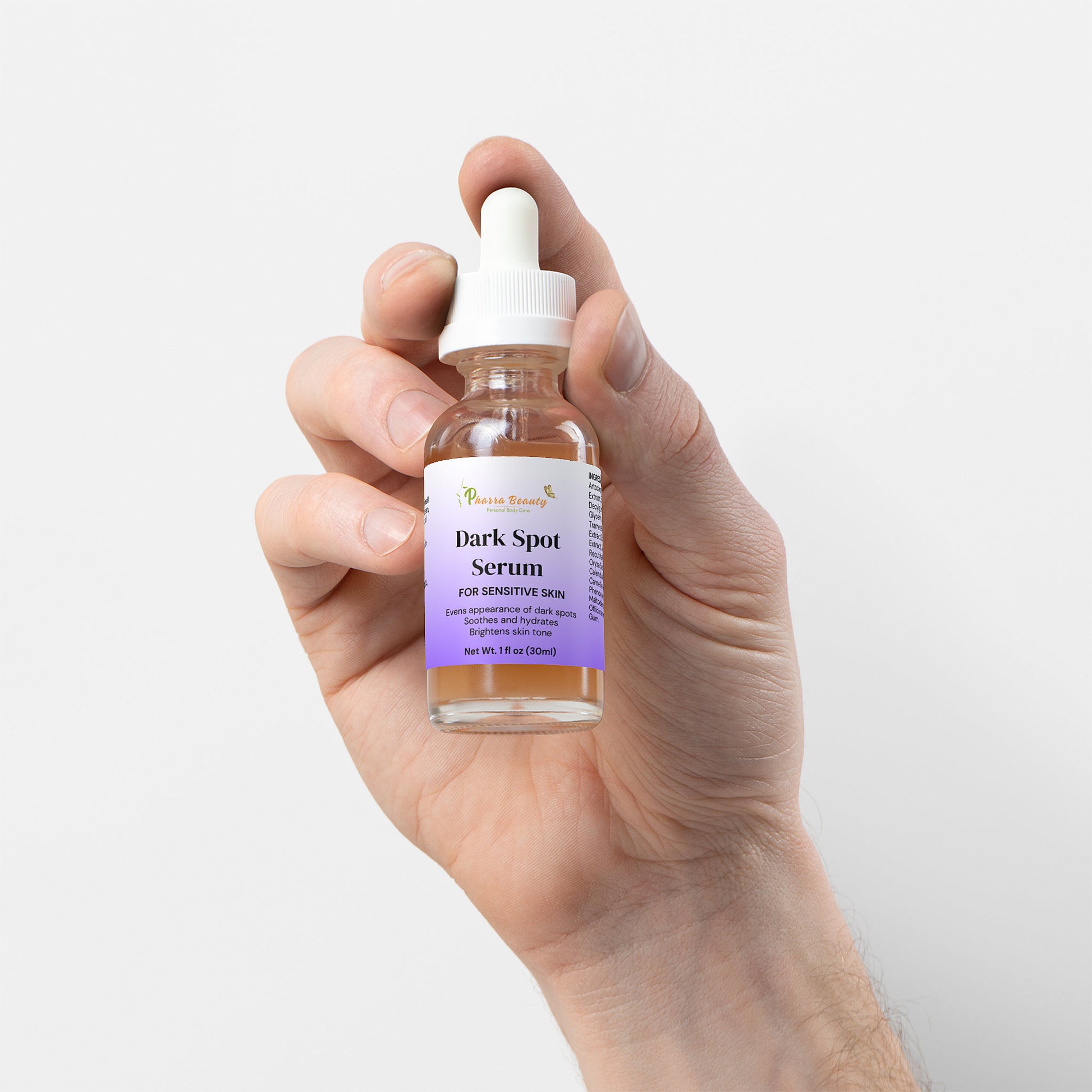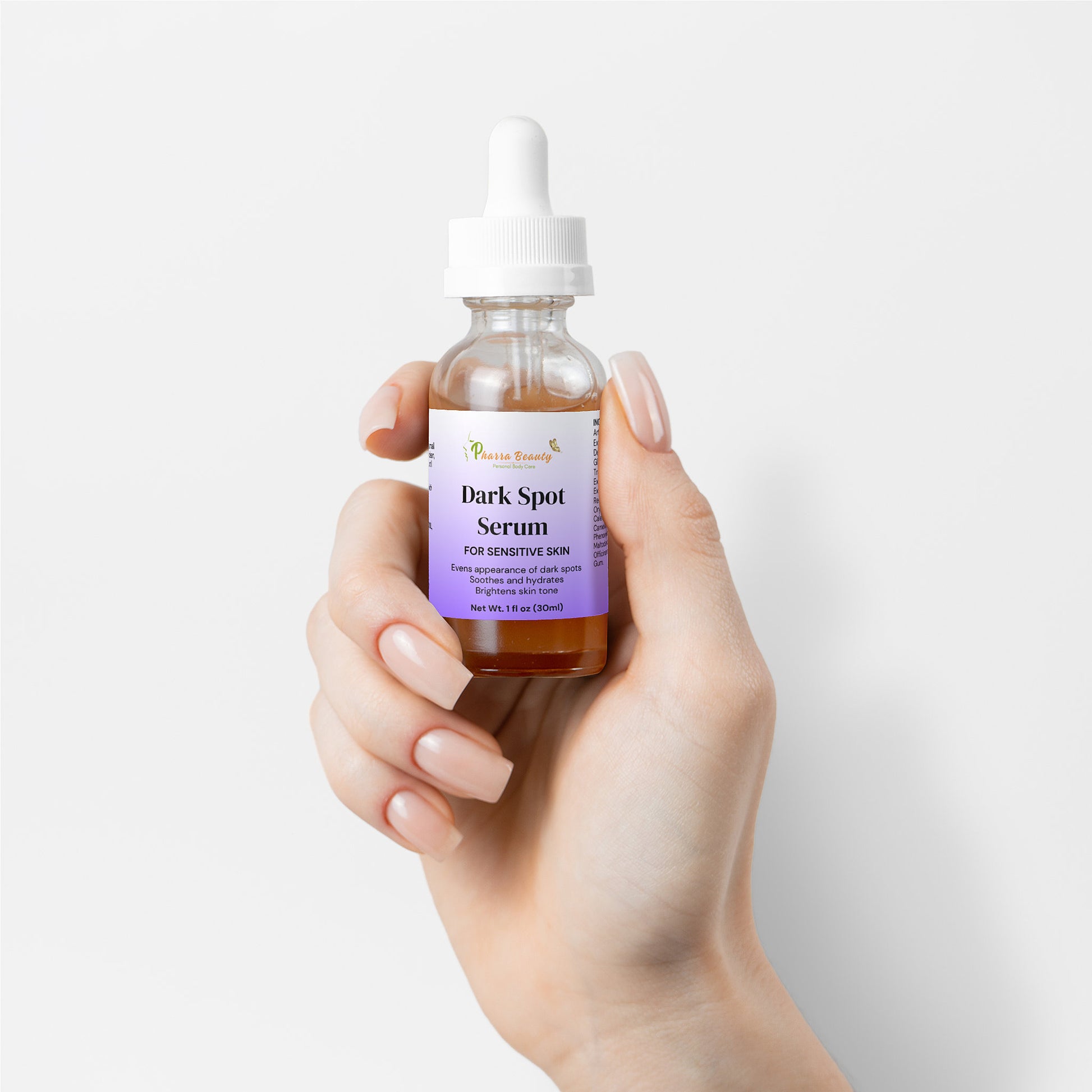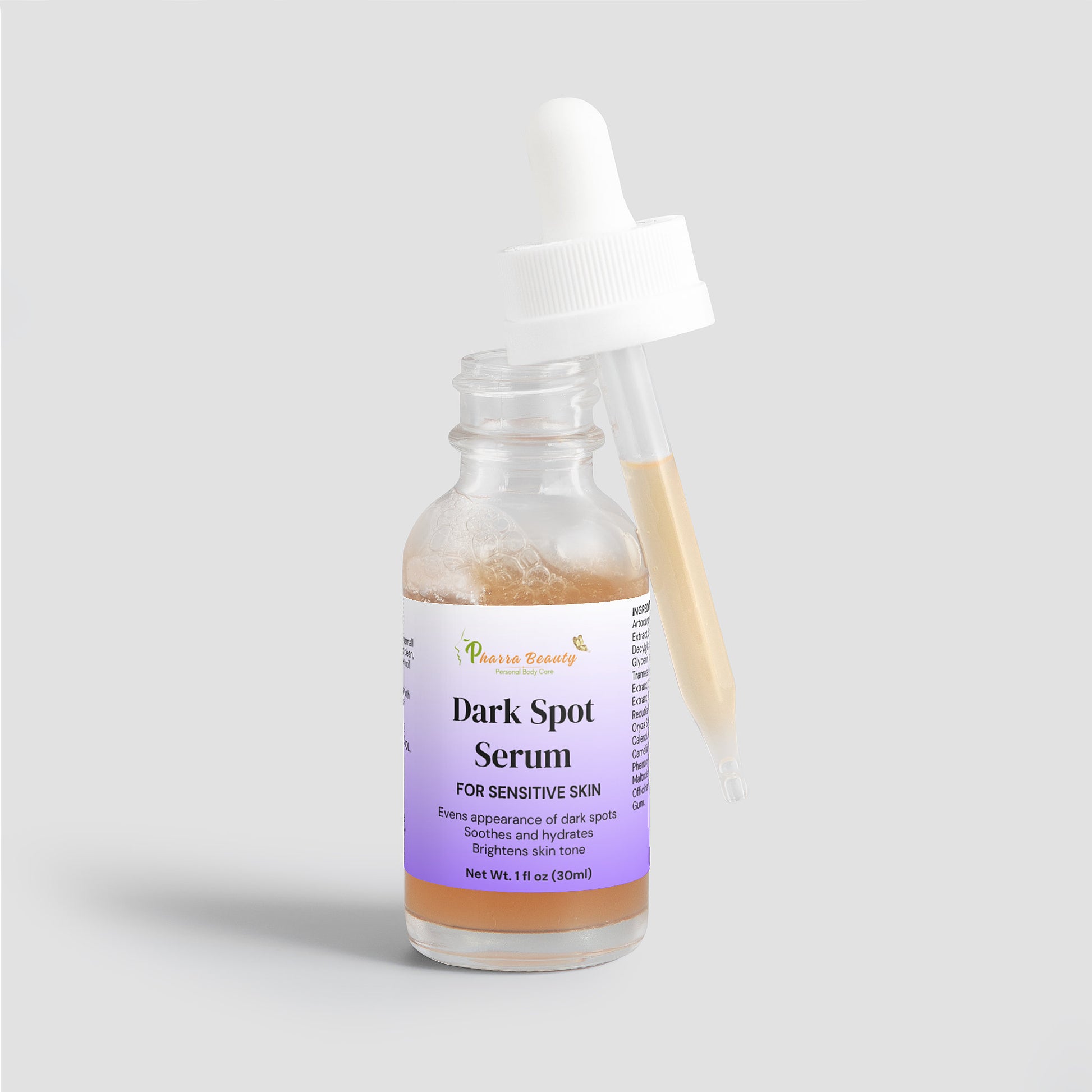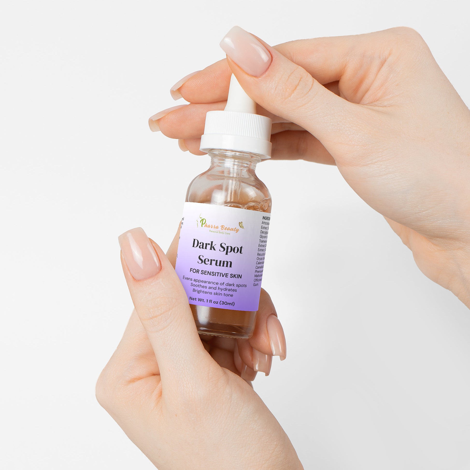 Introducing our Dark Spot Serum, designed for sensitive skin. Hydration sets the stage for targeted dark spot reduction. Natural extracts work together to brighten and even skin tone while providing soothing repair.