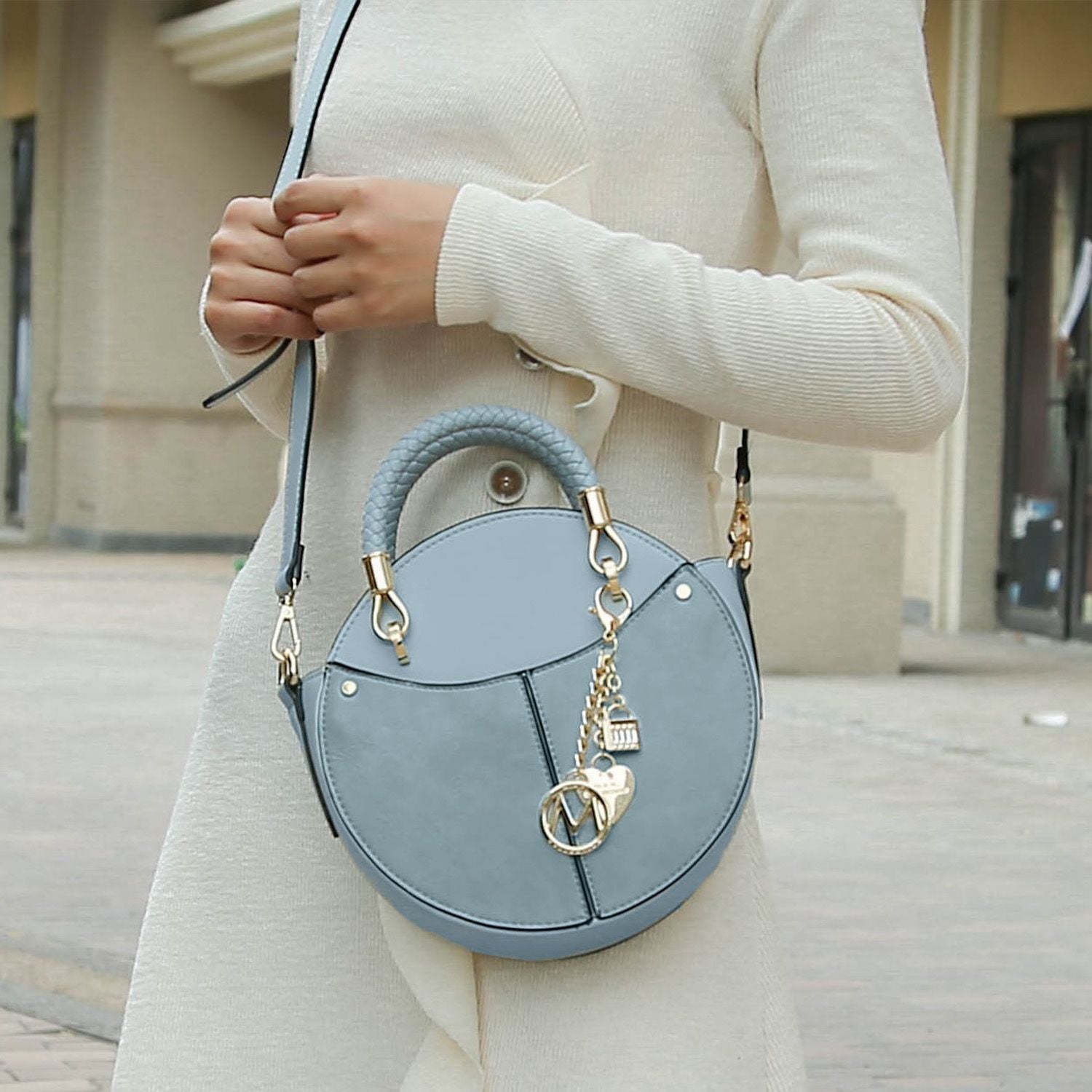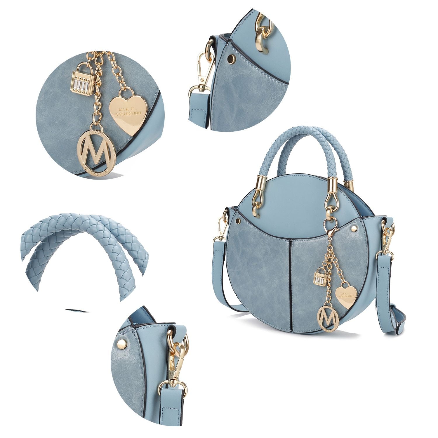 This stylish crossbody features luxurious gold-tone embellishments, making it a perfect everyday bag. It has a zipper closure and one main compartment. The design includes hand-painted edges, hand-braided top handles with gold hardware, and a comfortable strap for shoulder or crossbody wear. The bag also offers an interchangeable strap to easily update its look, and comes with a removable keychain.