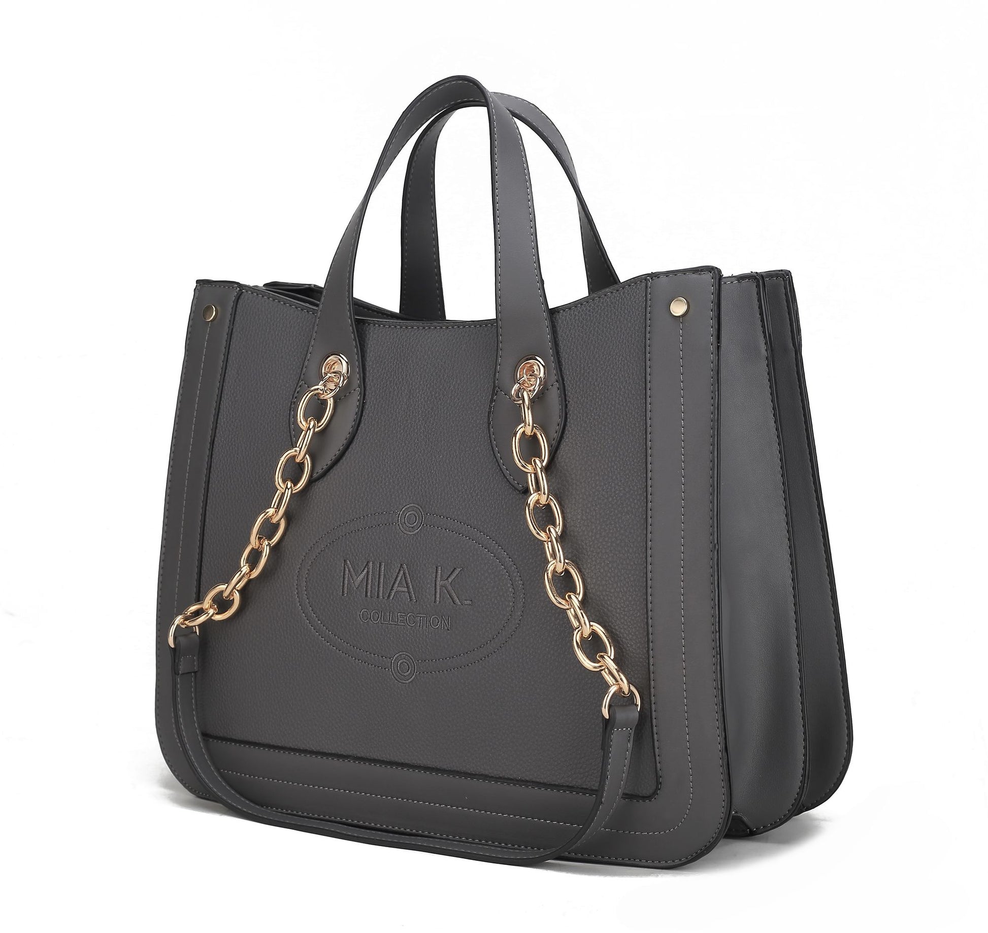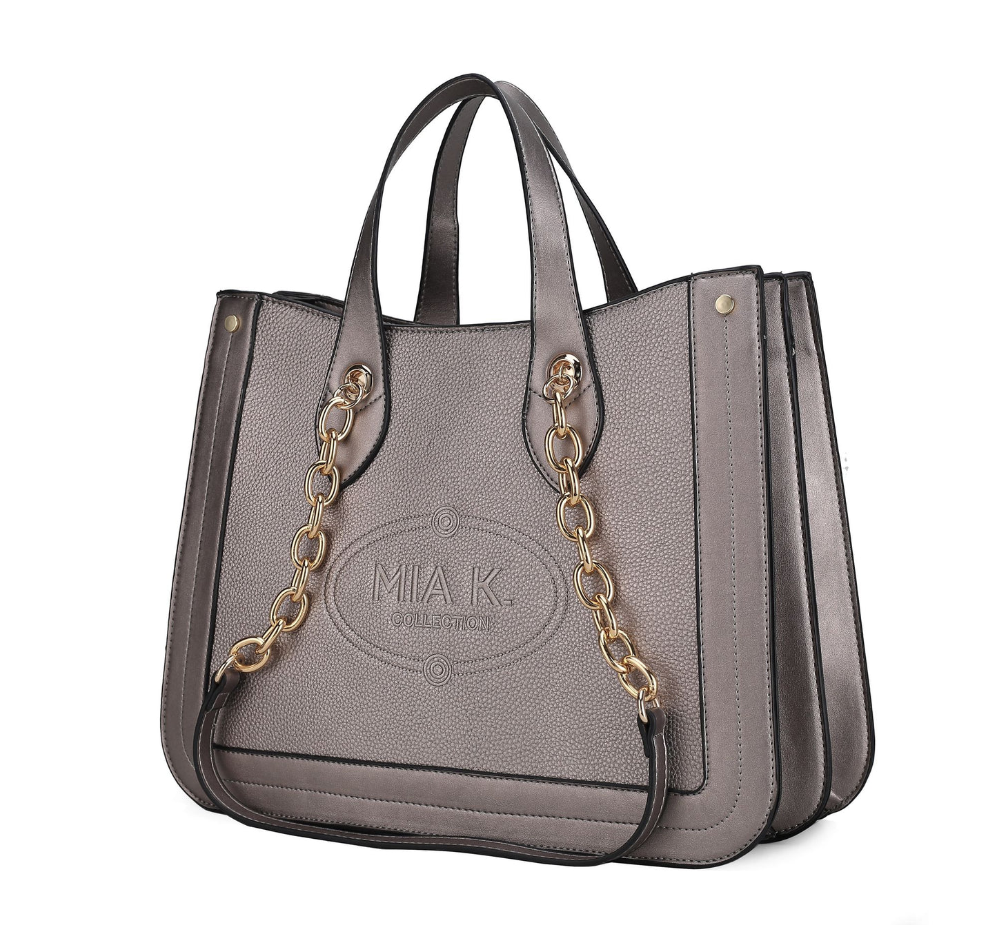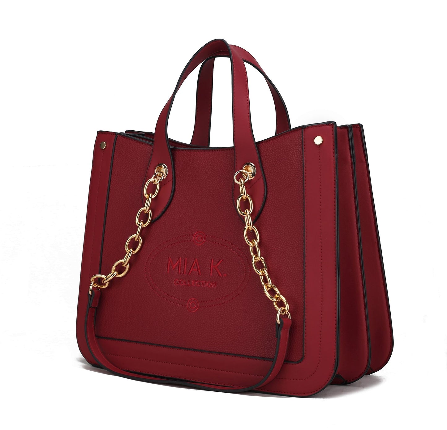 Specifications This spacious and stylish tote is perfect for both busy weekdays and fun weekends. Made from high-quality vegan leather, it features gold-tone accents and a structured design. A snap closure keeps your items secure, while two fully lined compartments provide plenty of room. Inside, you'll find one wall zip pocket and two slip pockets. The tote can be carried by the smooth top handles or worn on your shoulder with the adjustable strap. The exterior is elegantly accented with beautiful embroidery.