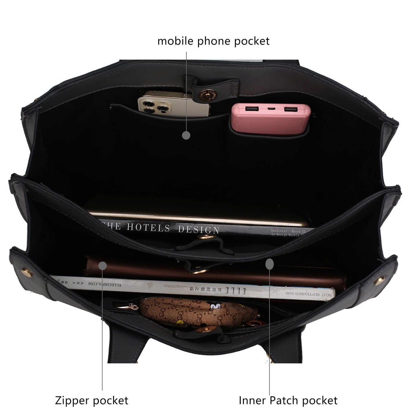 Interior: wall zip pocket and two slip pockets