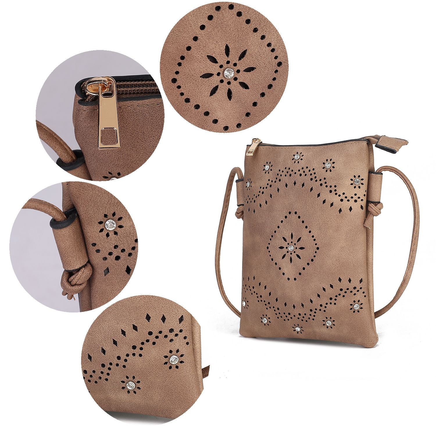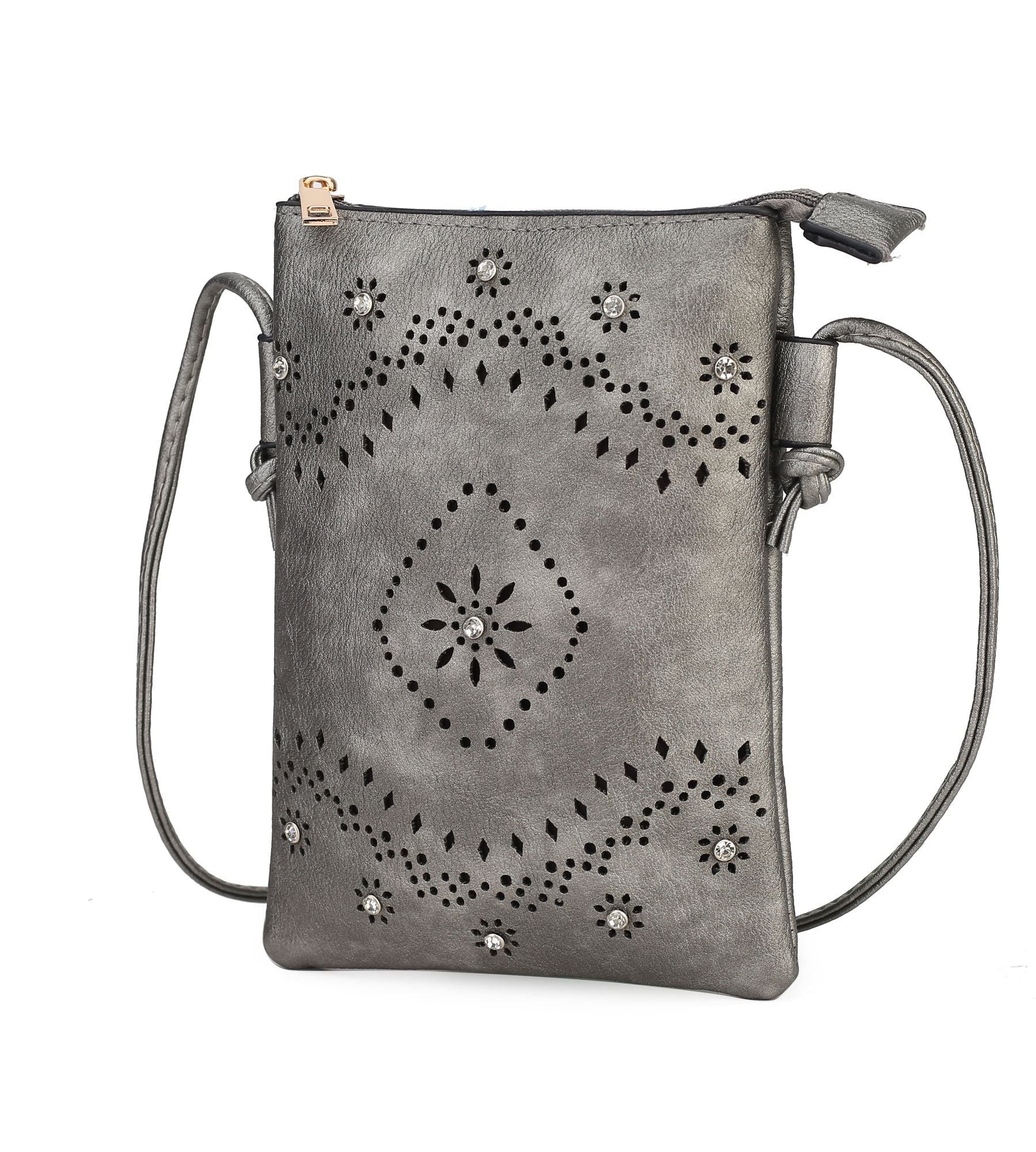 Features: Luxurious silver-tone embellishments, top zipper closure, textured woven design