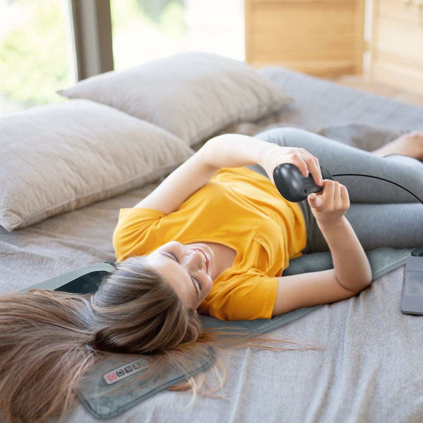 This full-body massage mat offers targeted vibration at 10 key points—neck, back, waist, buttocks, thighs, and calves—to help ease tension, stress, and fatigue. Choose from 9 vibration modes and 9 point-specific settings, with adjustable intensity and speed levels for a customized experience.