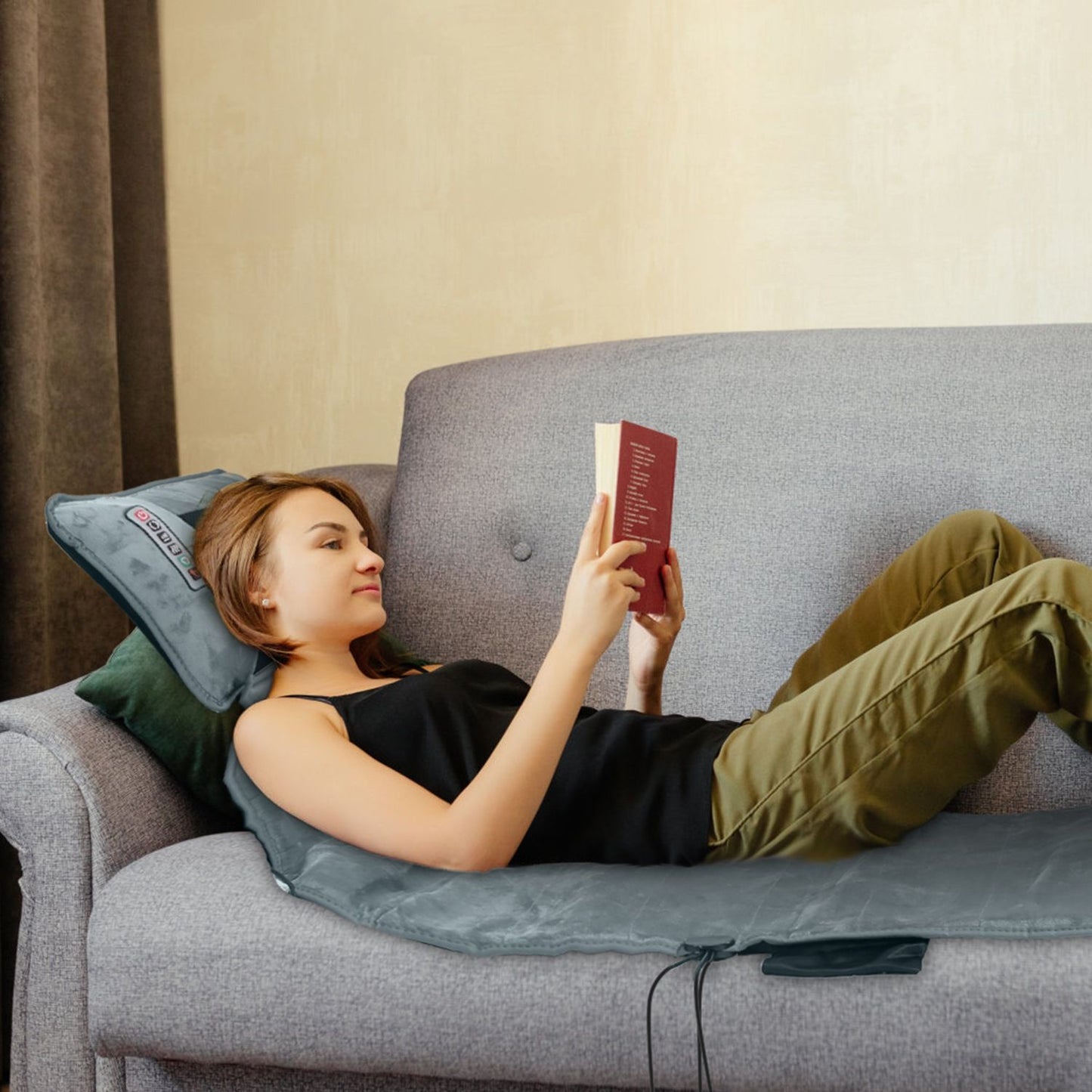 The soft plush surface and sponge padding make it cozy to lie or sit on, whether on a chair, recliner, couch, or floor. The anti-slip bottom keeps it securely in place. The built-in timer (10, 20, or 30 minutes) allows for hands-free relaxation.