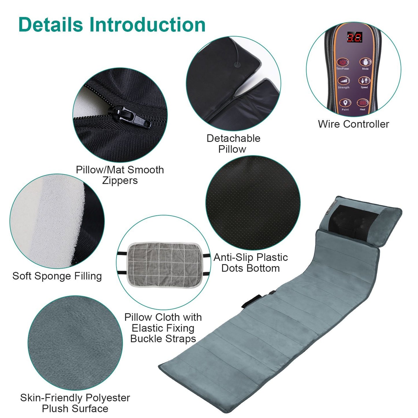 10 massage zones: neck, back, waist, buttocks, thighs, and calves