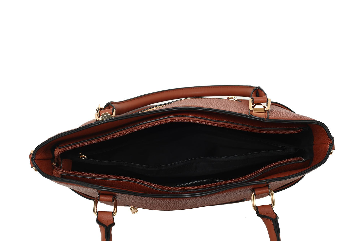 1 interior zipper pocket with a signature metal plate.