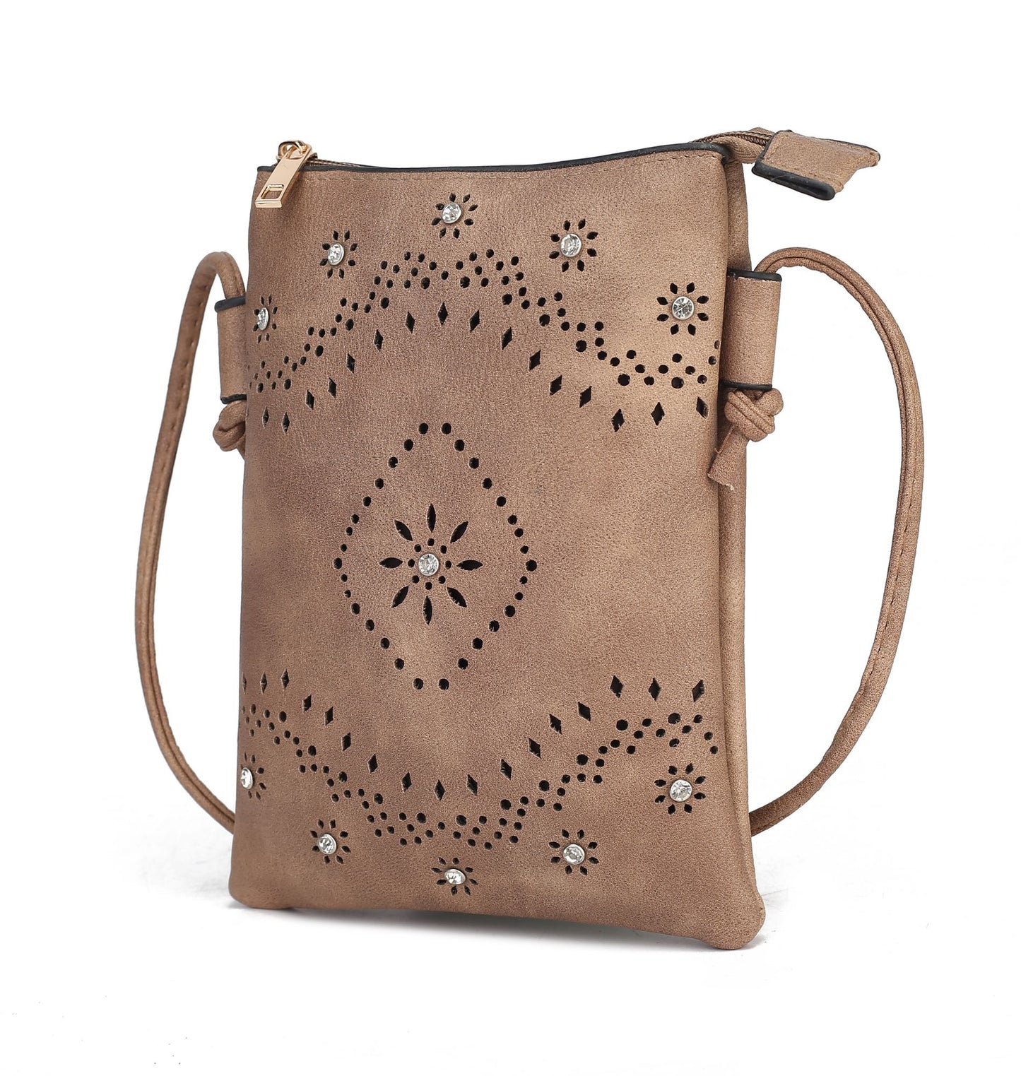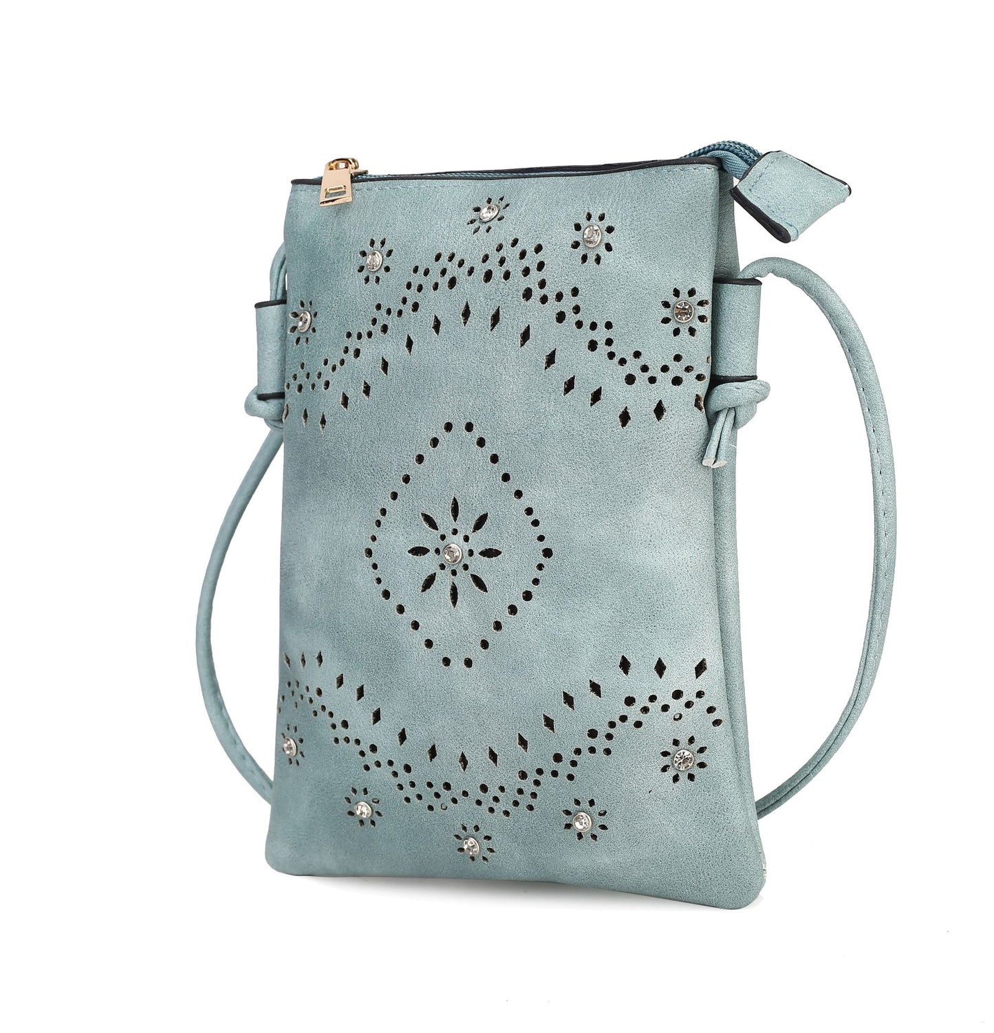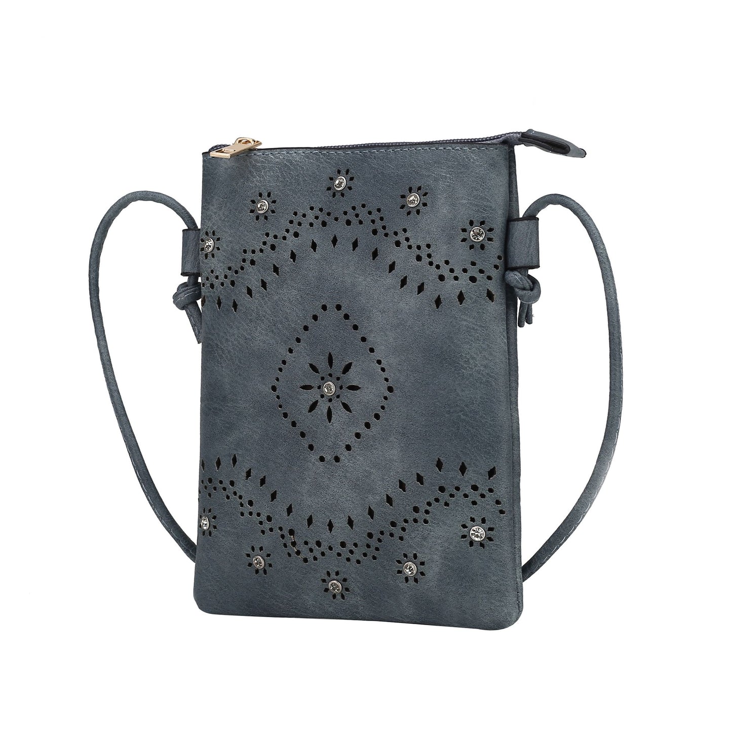 Features: Luxurious silver-tone embellishments, top zipper closure, textured woven design